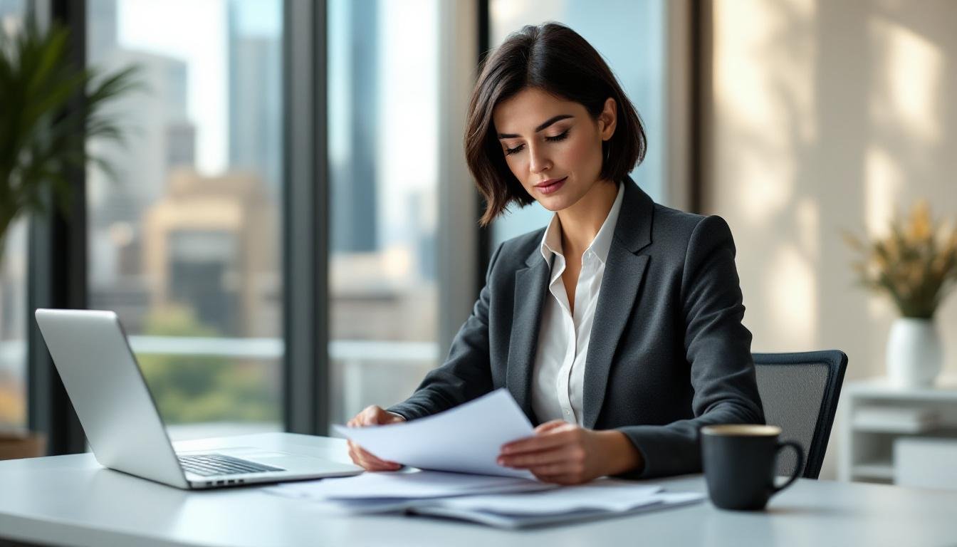 Australian immigration lawyer reviewing visa refusal documents at a desk in a modern law office